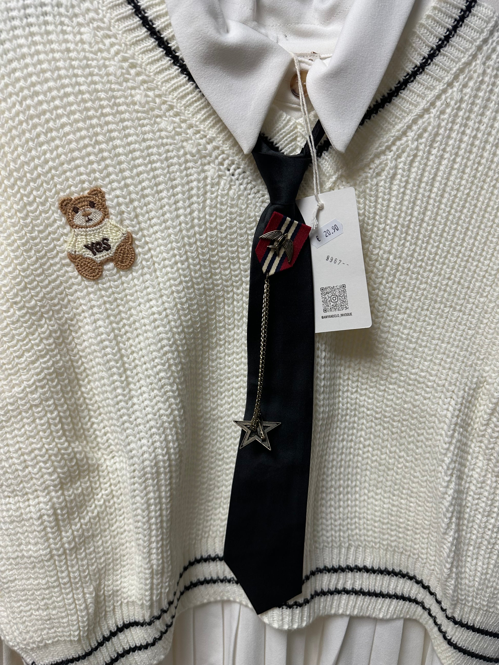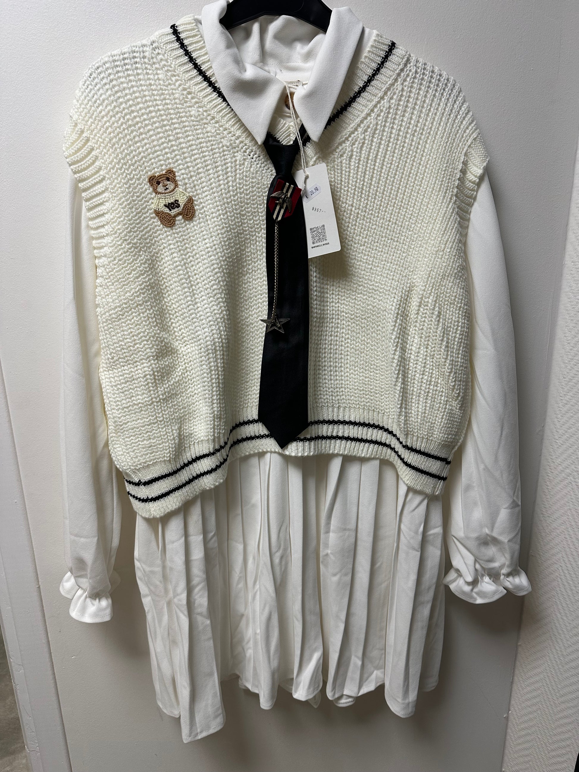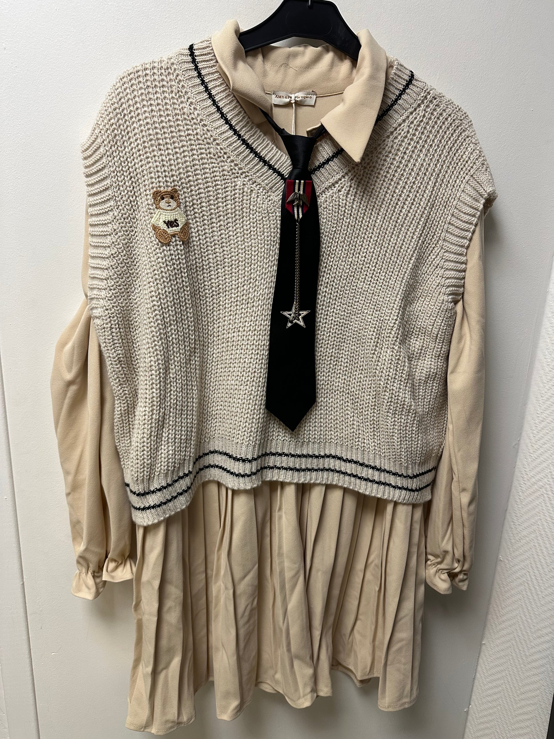 Magnifique, ensemble, trois pièces Indépendante, petite robe, tunique, plissé sur le bas boutonné sur le haut pull sans manches plus cravate à mettre ou pas deux tailles proposées