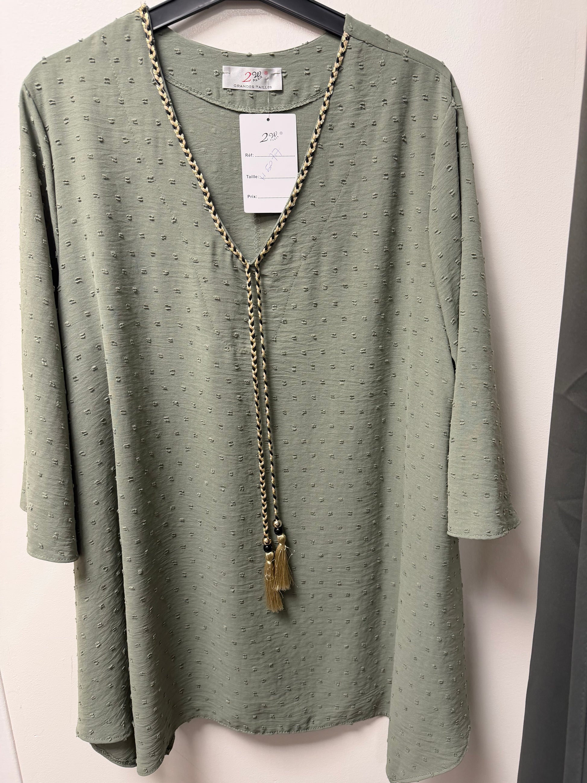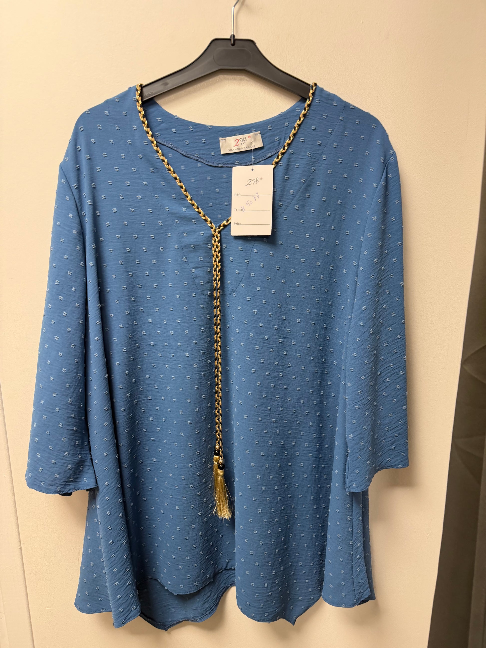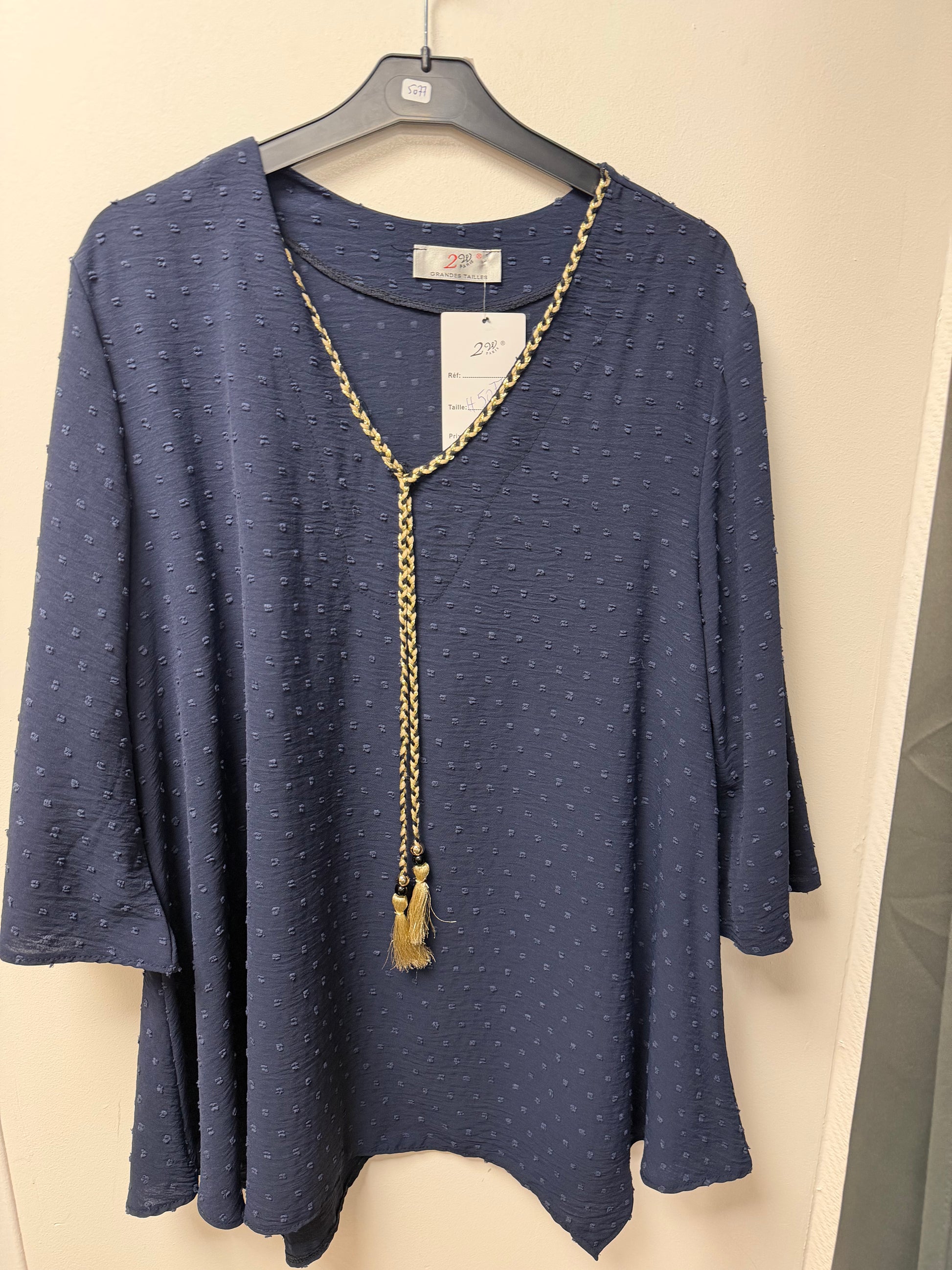 Tunique fluide à manches 3/4, élégante et confortable. Son tissu léger à relief discret apporte de la texture, tandis que le lien doré avec pampilles au col V ajoute une touche chic et féminine. 95 % polyester et 5 % élasthanne