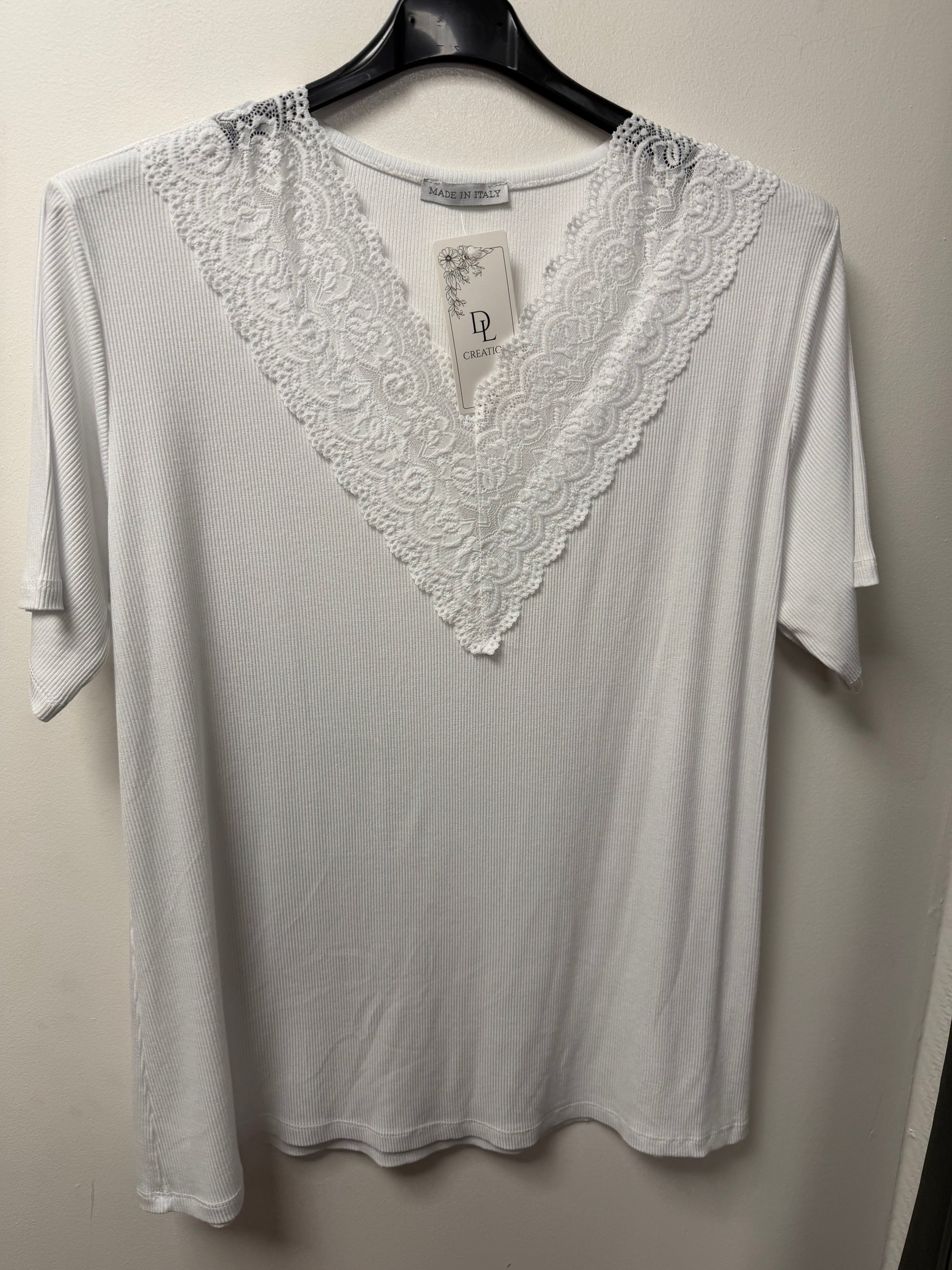 Le basique indispensable revisité. Ce t-shirt près du corps combine le confort et le raffinement d'une large dentelle au décolleté. 95% viscose 5% élasthane